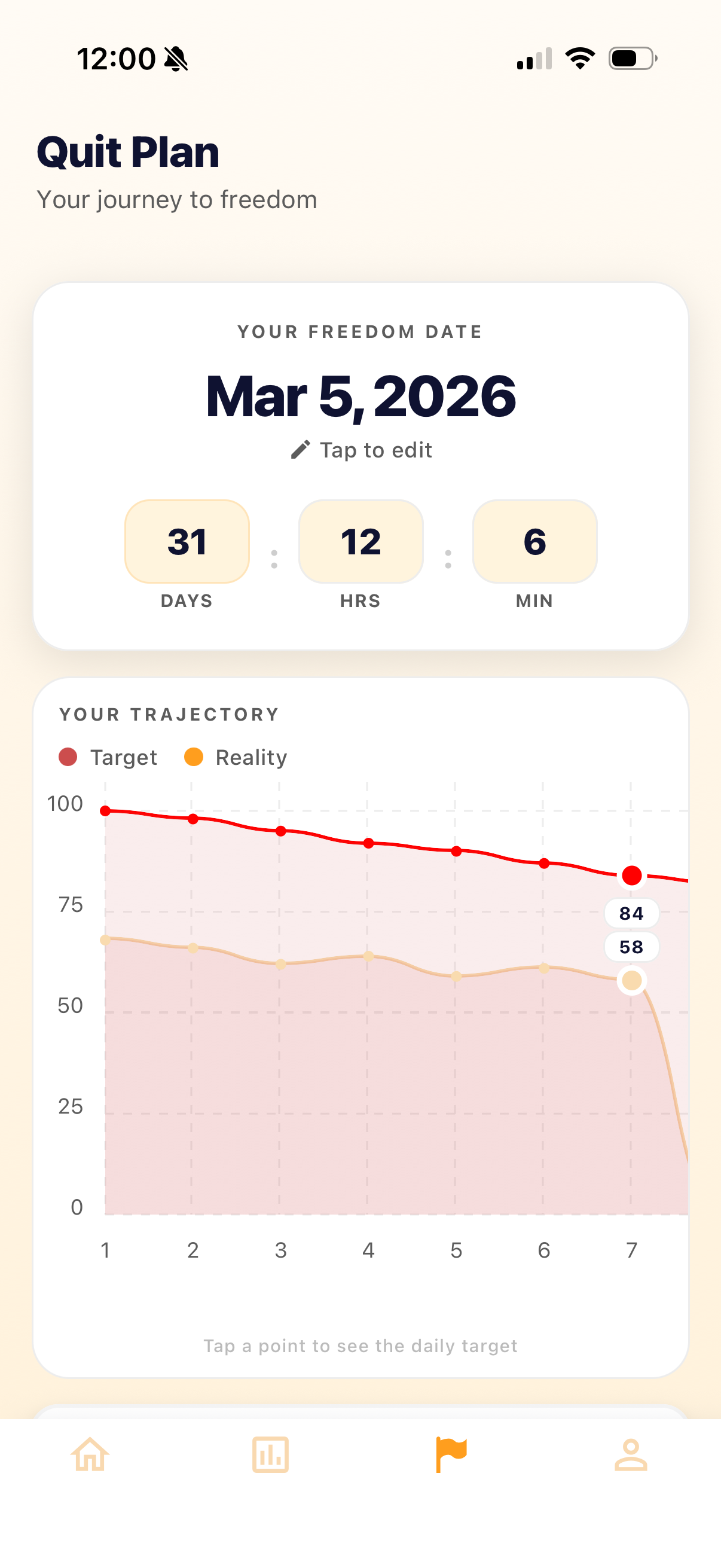 Set your quit date and let us generate a personalized plan to help you reduce your nicotine intake gradually. Stay on course with daily goals tailored to your needs.
